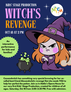 The Witch’s Revenge marks the debut production of NCCM’s new Youth Theater Program, an initiative designed to provide high-quality, year-round theater education for children ages 12 and under and their families throughout the region. The program is led by Claire Derriennic, an educator and theater-maker for young audiences with an MFA in Drama and Theatre for Youth. Derriennic brings international experience creating original theater for children in schools, museums, and community settings